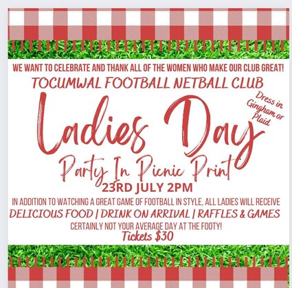 The Tocumwal Football Netball Club invite all of the lovely ladies in our community to come and enjoy a great afternoon under the Marquee enjoying a great game of football. The theme is "Party in Picnic Print", so dress up in Gingham or Plaid. All ladies will recieve a drink on arrival as well as food, raffles and games. The TFNC want to celebrate and thank all of the women who make our club great! See you there.
