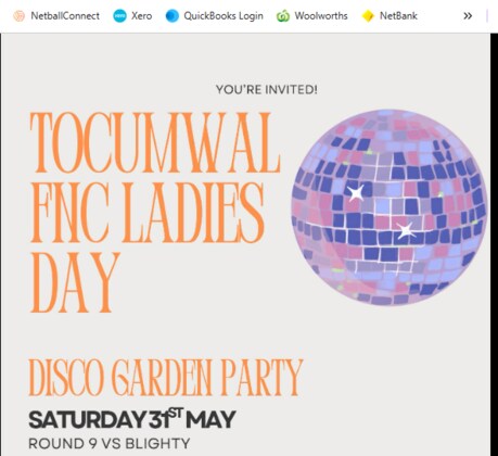 You're Invited! Tocumwal FNC Ladies Day - DISCO PARTY! Saturday 31st May  Round 9 Vs Blighty Upstairs clubrooms from 2pm Dress: Nice dress with pops of colour and/or a touch of sparkle $50 Package includes drinks (3x beer/wine OR 2x spirit tickets) & nibbles $30 Non-alcoholic (includes 1x soft drink/water ticket) & nibbles Games, prizes & raffles Continue the party with TFNC Spotify Shuffle RSVP by 22nd May