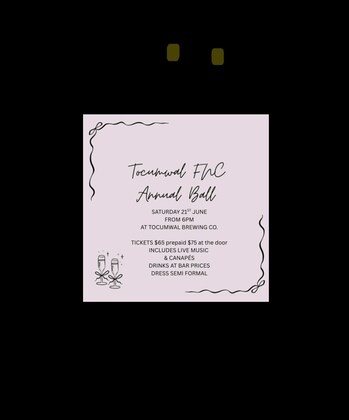 Tocumwal Football Netball Club 2025 Annual Ball   Saturday 21st June From 6:00pm At Tocumwal Brewing Co. 31–35 Murray Street, Tocumwal Tickets: $65 per person   Includes live music by JB & Me and a selection of canapés and finger food Drinks available at bar prices 18+ event   Dress to impress and join us for a great night celebrating the season so far!